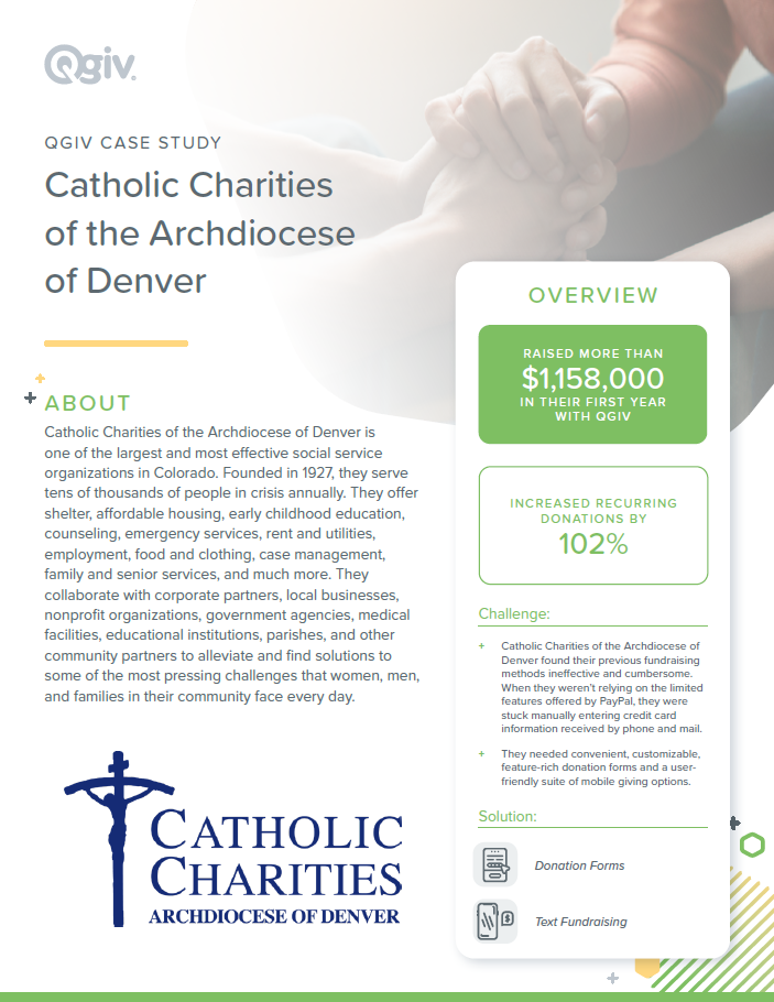 The members of the resource development team of the Catholic Charities Archdiocese of Denver have a lot on their plates. They’re responsible for securing funding for the agency’s myriad programs, which do everything from providing meals to the hungry to serving senior citizens to offering pregnancy counseling. The small, dedicated team of fundraisers began accepting online donations years ago, using a simple PayPal form to accept gifts from their supporters. The agency quickly outgrew PayPal’s basic features and decided to upgrade to a more functional platform. They signed up for Qgiv, an online payment platform for nonprofit and faith-based charities, and have experienced exceptional growth ever since.