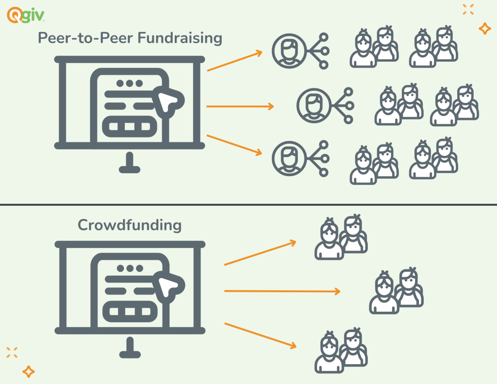 The biggest difference between peer-to-peer fundraising and crowdfunding is the number of people asking for donations. Peer-to-peer fundraising often has many people asking for donations on behalf of a nonprofit, while crowdfunding is usually one person or group asking as wide an audience as possible for donations.