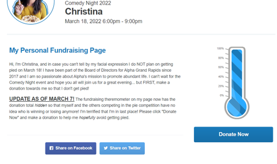Alpha Grand Rapids did a great job promoting the competition on social media and coaching participants to highlight their pleas to be spared from a pie in the face on their personal fundraising pages!